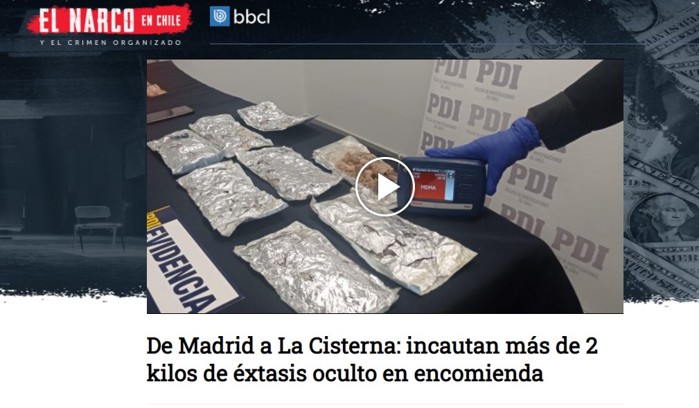 Estás en : Inicio / ADUANA INFORMA / ADUANA EN LA PRENSA Biobio Chile: De Madrid a La Cisterna: incautan más de 2 kilos de éxtasis oculto en encomienda Viernes 8 de abril de 2022 Artículos relacionados Aduana detecta contrabando de dinero... 24 Horas: #Informe24 Detalles de la... CHV: Aduanas ya tiene test para... [Las Últimas Noticias]: Chile le... [TVN Red Valparaíso]: Ministro Marcel...