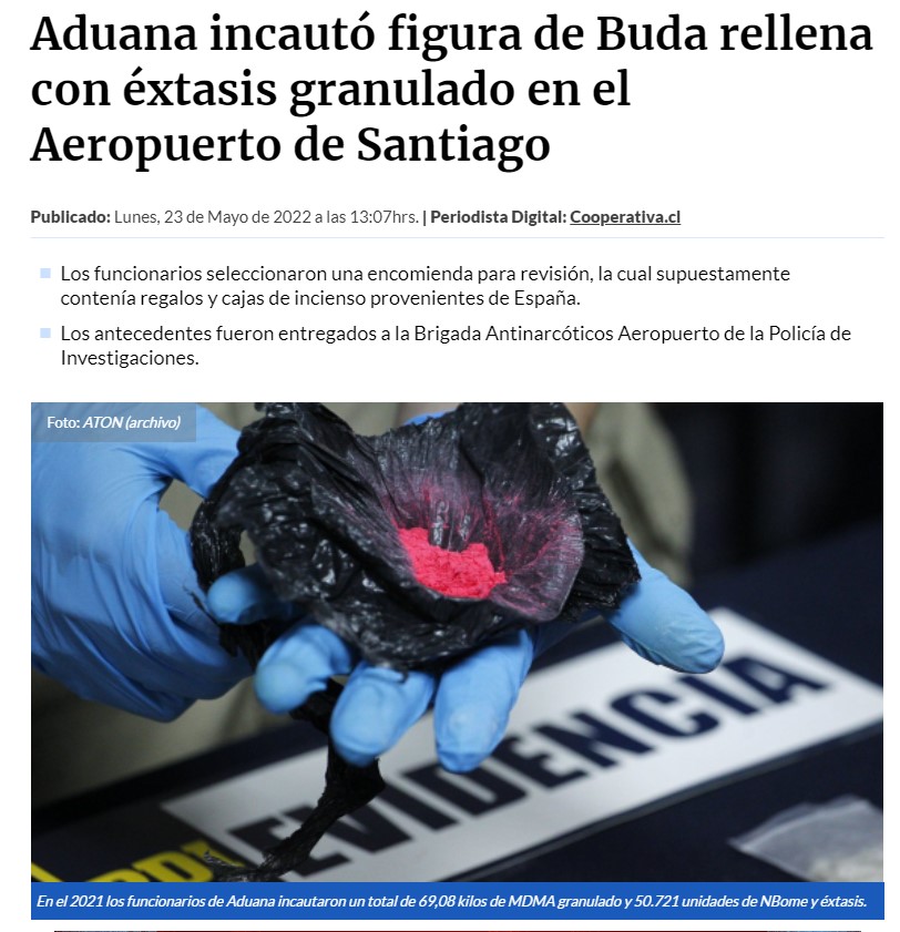 Estás en : Inicio / ADUANA INFORMA / ADUANA EN LA PRENSA Cooperativa: Aduana incautó figura de Buda rellena con éxtasis granulado en el Aeropuerto de Santiago Martes 24 de mayo de 2022 Artículos relacionados Aduana detecta contrabando de dinero... 24 Horas: #Informe24 Detalles de la... CHV: Aduanas ya tiene test para... [Las Últimas Noticias]: Chile le... [TVN Red Valparaíso]: Ministro Marcel...