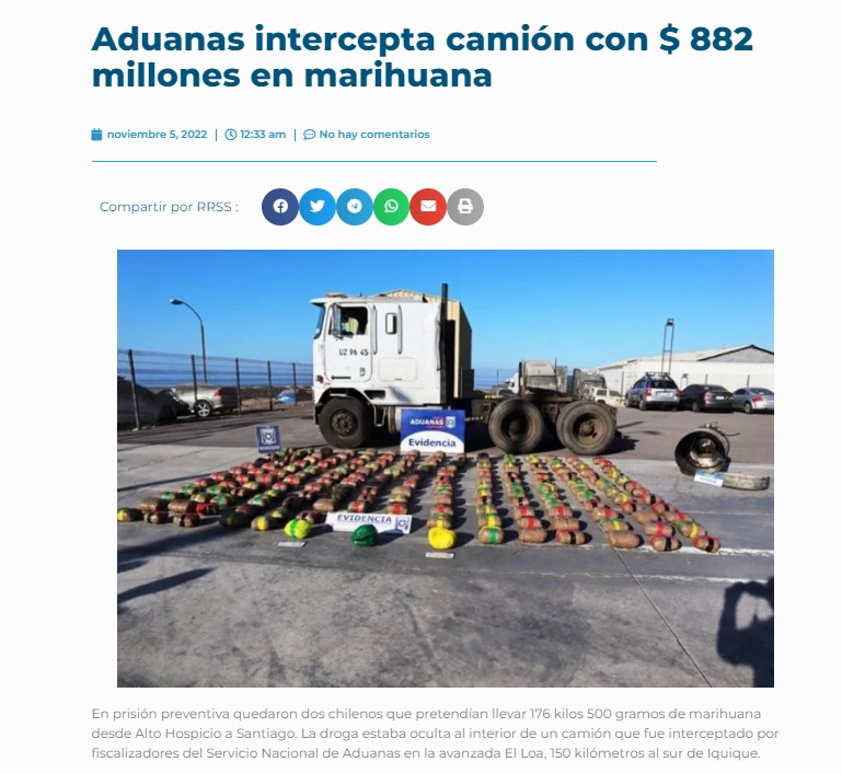 Estás en : Inicio / ADUANA INFORMA / ADUANA EN LA PRENSA Diario Longino: Aduanas intercepta camión con $882 millones en marihuana Lunes 7 de noviembre de 2022 Artículos relacionados Aduana detecta contrabando de dinero... 24 Horas: #Informe24 Detalles de la... CHV: Aduanas ya tiene test para... [Las Últimas Noticias]: Chile le... [TVN Red Valparaíso]: Ministro Marcel...