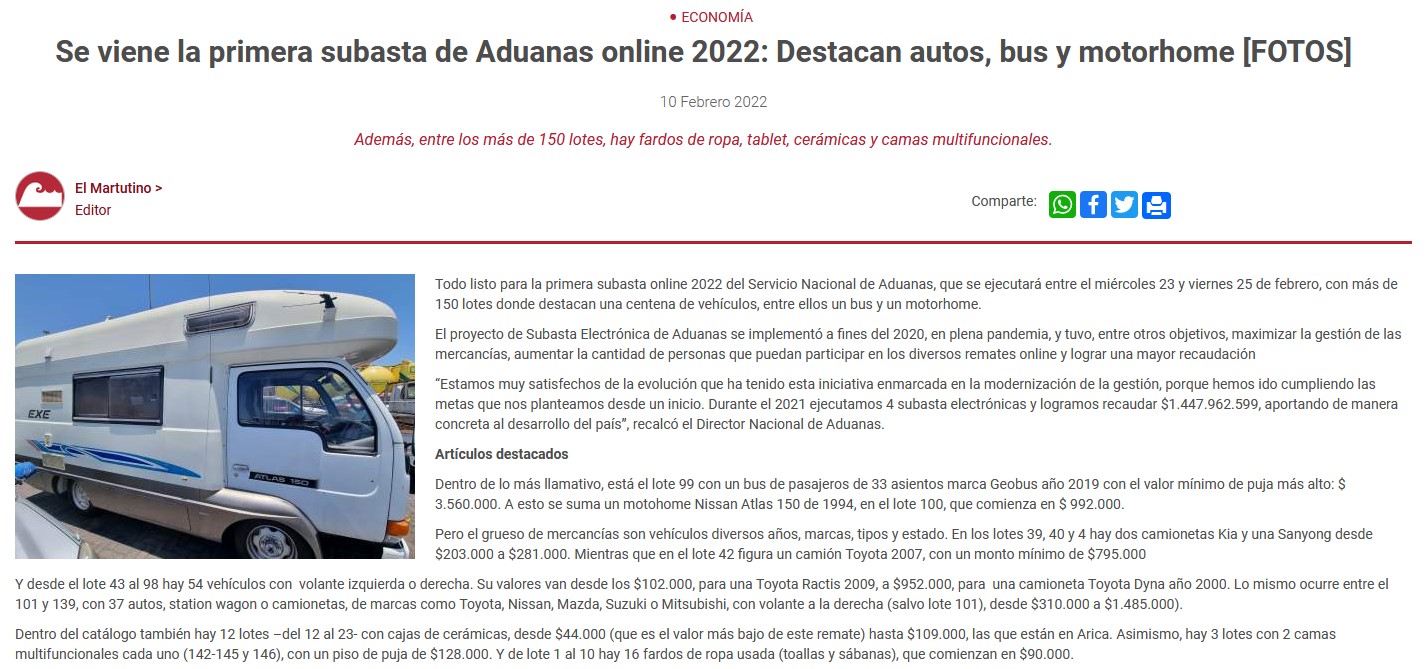 Estás en : Inicio / ADUANA INFORMA / ADUANA EN LA PRENSA El Martutino: Se viene la primera subasta de Aduanas online 2022: Destacan autos, bus y motorhome Lunes 3 de octubre de 2022 Artículos relacionados Aduana detecta contrabando de dinero... 24 Horas: #Informe24 Detalles de la... CHV: Aduanas ya tiene test para... [Las Últimas Noticias]: Chile le... [TVN Red Valparaíso]: Ministro Marcel...