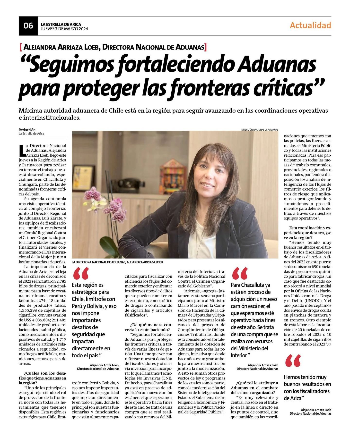 Estás en : Inicio / ADUANA INFORMA [LA ESTRELLA DE ARICA]: “Seguimos fortaleciendo Aduanas para proteger las fronteras críticas” Jueves 7 de marzo de 2024 Artículos relacionados Fiscalizadores de Aduanas interceptan... Aduana, Armada y Seremi de Seguridad... Trabajo interangencial permite la... Trabajo de fiscalización de Aduanas... Aduana de Coquimbo destruye más de 7...