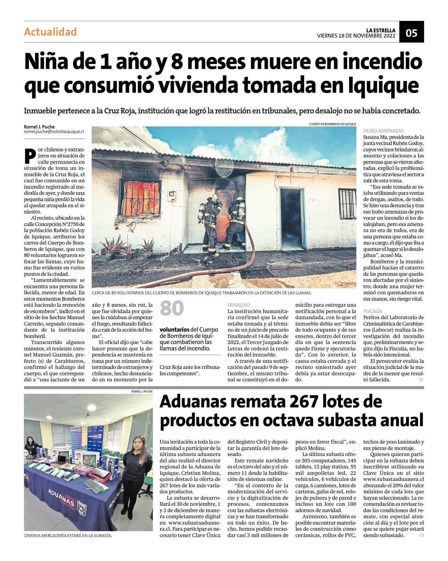 Estás en : Inicio / ADUANA INFORMA / ADUANA EN LA PRENSA La Estrella de Iquique: Aduanas remata 267 lotes de productos en octava subasta anual Viernes 18 de noviembre de 2022 Artículos relacionados Aduana detecta contrabando de dinero... 24 Horas: #Informe24 Detalles de la... CHV: Aduanas ya tiene test para... [Las Últimas Noticias]: Chile le... [TVN Red Valparaíso]: Ministro Marcel...