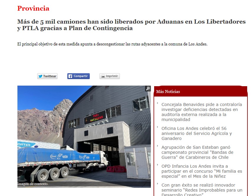 Estás en : Inicio / ADUANA INFORMA / ADUANA EN LA PRENSA Los Andes Online: Más de 5 mil camiones han sido liberados por Aduanas en Los Libertadores y PTLA gracias a Plan de Contingencia Artículos relacionados Aduana detecta contrabando de dinero... 24 Horas: #Informe24 Detalles de la... CHV: Aduanas ya tiene test para... [Las Últimas Noticias]: Chile le... [TVN Red Valparaíso]: Ministro Marcel...