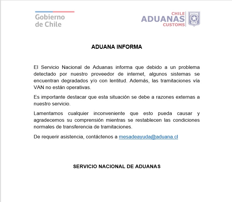 Estás en : Inicio / ADUANA INFORMA / NOTICIAS INSTITUCIONALES Aduanas informa intermitencias en algunos sistemas por razones externas al Servicio Martes 5 de diciembre de 2023 Artículos relacionados Aduana dicta segundo curso de... Balance del Plan Nacional contra el... Se mantiene apoyo a ingreso de... Con feria de servicios tributarios se... Equipos de Aduanas de Coquimbo y...