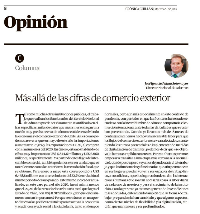 Estás en : Inicio / ADUANA INFORMA / NOTICIAS INSTITUCIONALES Crónica Chillán: Más allá de las cifras de comercio exterior Martes 22 de junio de 2021 Artículos relacionados Aduana dicta segundo curso de... Balance del Plan Nacional contra el... Se mantiene apoyo a ingreso de... Con feria de servicios tributarios se... Equipos de Aduanas de Coquimbo y...