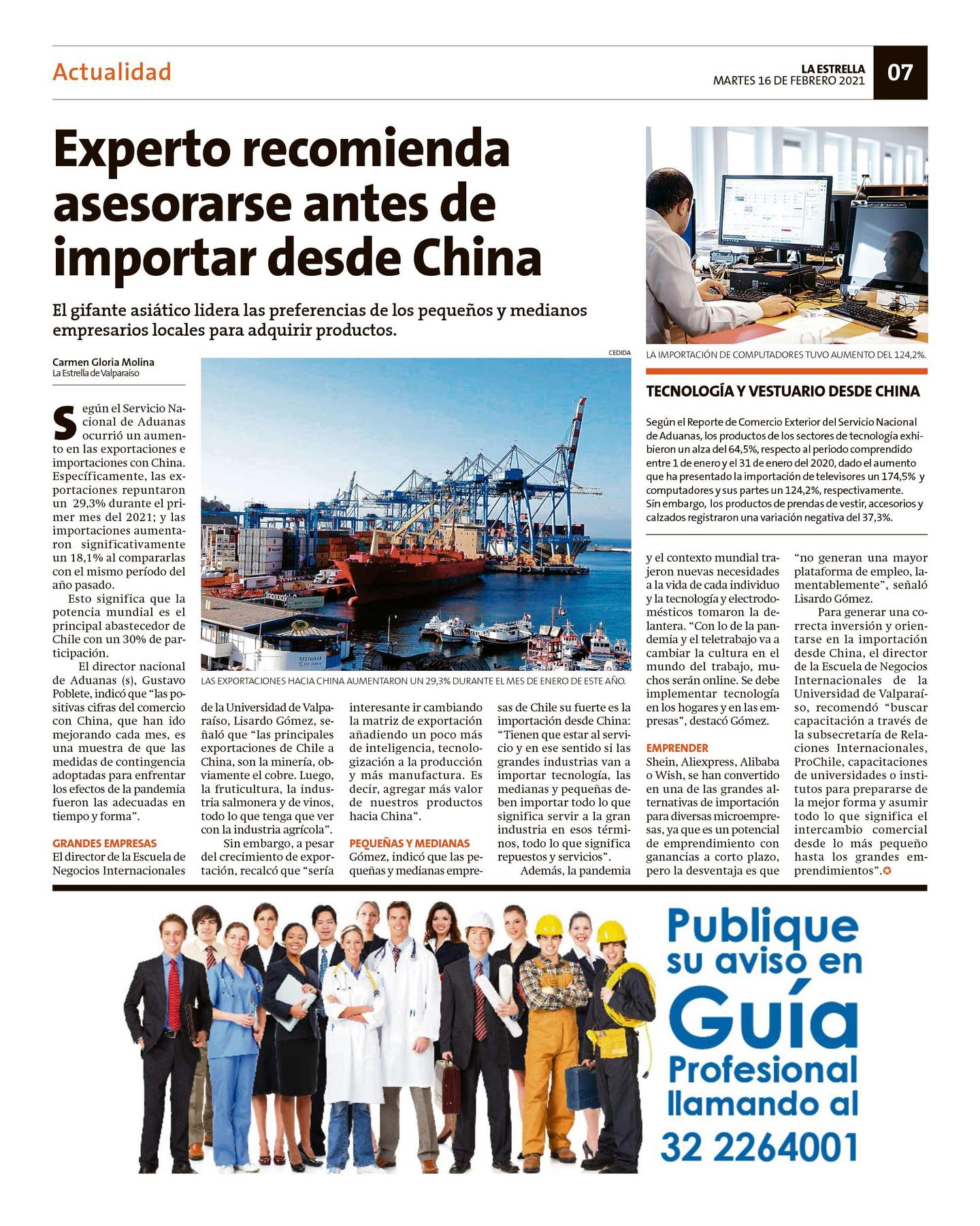 Estás en : Inicio / ADUANA INFORMA / ADUANA EN LA PRENSA El Mercurio de Valparaíso: Experto recomienda asesorarse antes de importar desde China Artículos relacionados [RADIO COOPERATIVA] Se comenzará a... [diarioestrategia.cl] Plataformas que... MEGA: Cobrarán IVA por compras... CANAL 13: Entrevista a Alejandra... 24 HORAS: Compras internacionales...