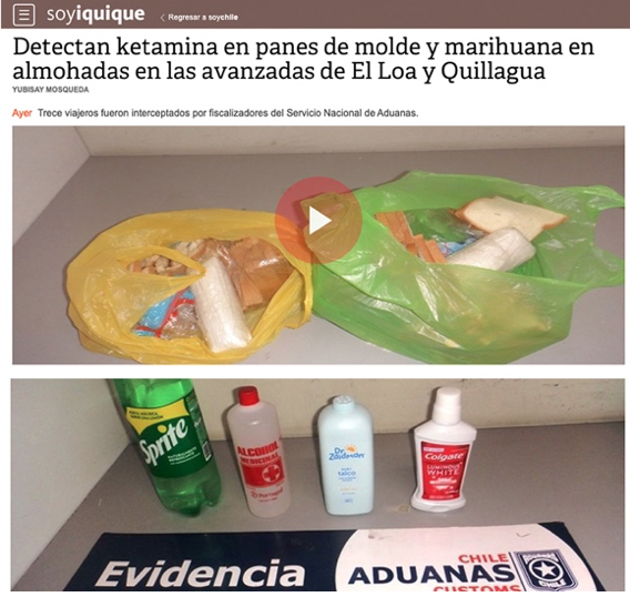 Estás en : Inicio / ADUANA INFORMA / NOTICIAS INSTITUCIONALES Soychile.cl: Detectan ketamina en panes de molde y marihuana en almohadas en las avanzadas de El Loa y Quillagua. Trece viajeros fueron interceptados por fiscalizadores del Servicio Nacional de Aduanas. Viernes 25 de junio de 2021 Artículos relacionados Aduana dicta segundo curso de... Balance del Plan Nacional contra el... Se mantiene apoyo a ingreso de... Con feria de servicios tributarios se... Equipos de Aduanas de Coquimbo y...