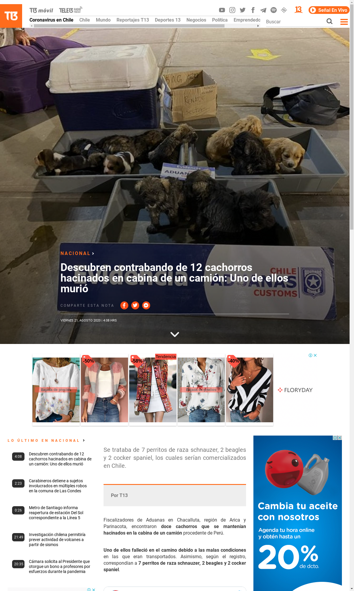 T13: T13 Descubren contrabando de 12 cachorros hacinados en cabina de un camión Uno de ellos murió